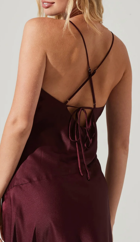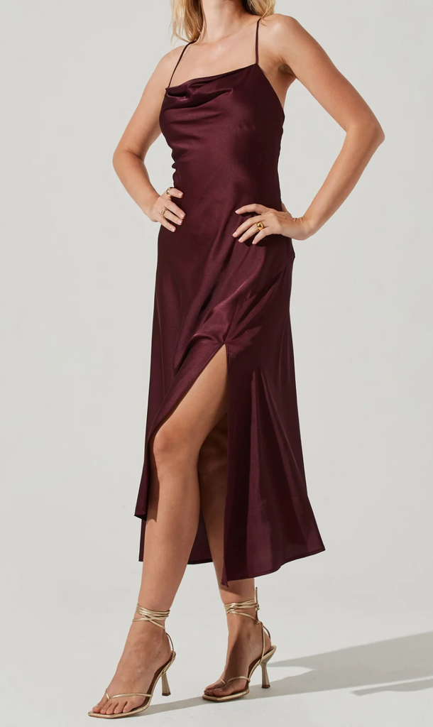 Make your special occasion memorable with the Gia Midi. Starting with a sexy cowl neckline, this silhouette continues down to a relaxed bodice and asymmetrical skirt. Front slit accent and cross strap back make this dress your choice for a romantic occasion.