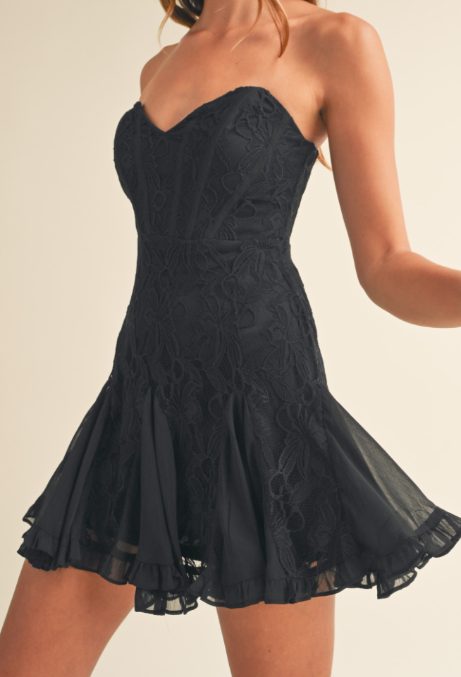 Our stunning lace dress showcasing a sweetheart neckline, corset bodice, and a flattering fit-and-flare silhouette.