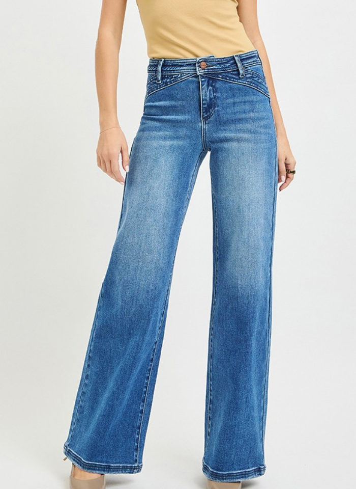 HIGH RISE WIDE LEG WAIST DETAIL JEANS - Rise 10" | Inseam 32 1/2" in size 3/26 - Model Info: Height 5'8" | Waist 24" | Hips 34" - Model is wearing size 25