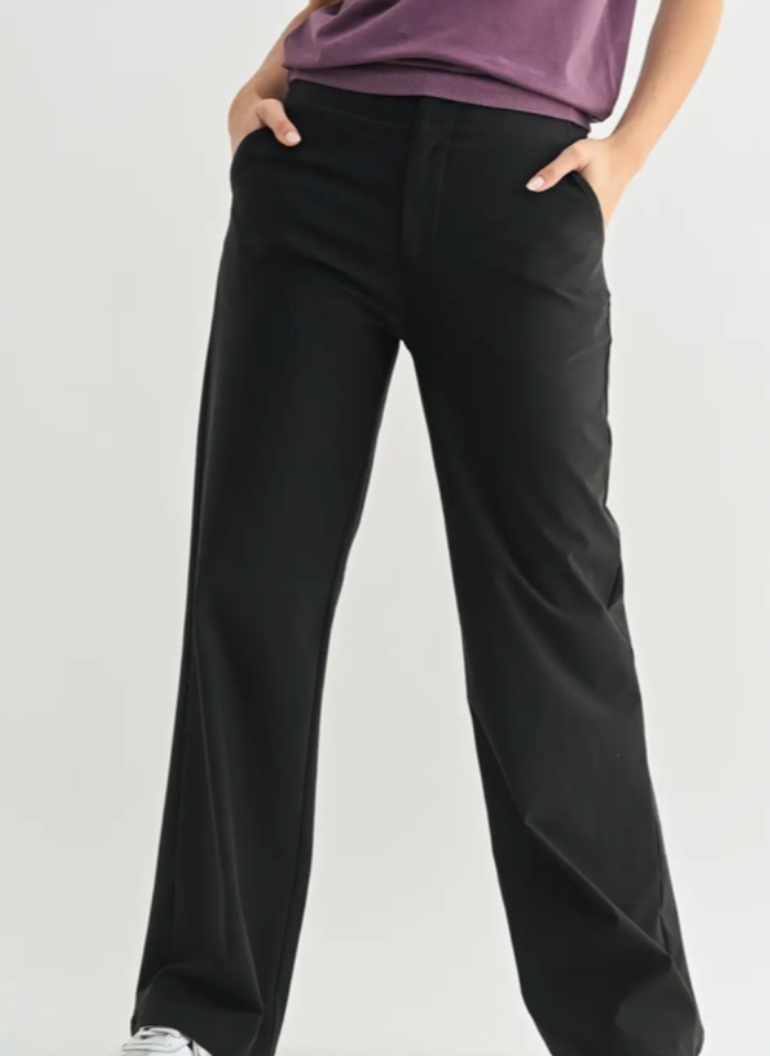 Meet your new go-to Quinn Pants—perfect for spring and beyond. Made from a nylon-spandex blend, these pants are cool to the touch, breathable, and moisture-wicking, keeping you fresh and sweat-free all day long. The sleek design features a zip-up front with two metal clasp closures, ensuring a minimal, streamlined look without any bulky buttons. The wide-leg fit provides ample room and effortless comfort, making them ideal for everything from office days to weekend outings with friends. Look polished, feel comfortable, and stay cool—no matter where the day takes you.