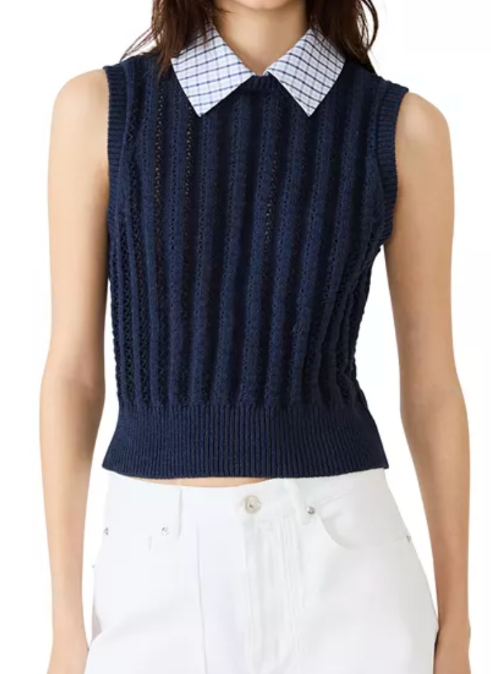 This sleeveless knit top features a removable plaid collar and a removable neck tie, giving you endless styling options. Wear it clean and classic, add the collar for a preppy twist, or style it with the neck tie for a polished statement look.