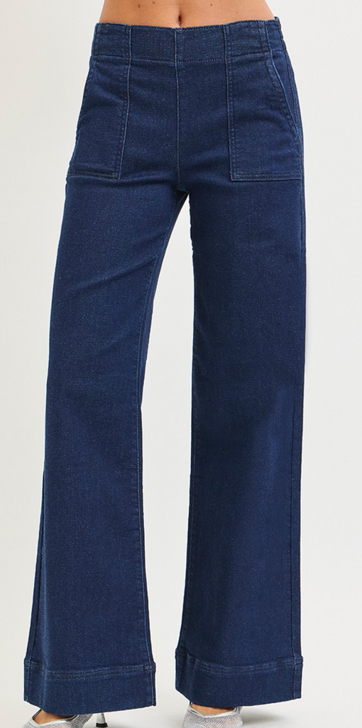 ELASTIC BAND HIGH RISE WIDE JEANS WITH PATCH POCKETS