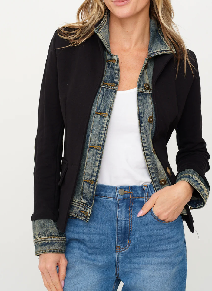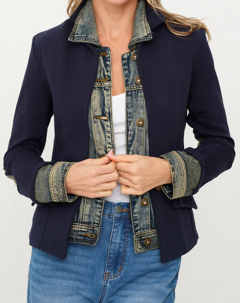 Made in Italy with love…this is one of our most coveted style is back. The attention to detail on this jacket is what makes it a true novelty piece. The mix of a classic blazer with denim gives it an edge that can be dressed down with your favorite white tee or dressed up with a sophisticated blouse. Featuring double layered edges, denim elbow patches and a textured pattern, get this one before it sells out again!
