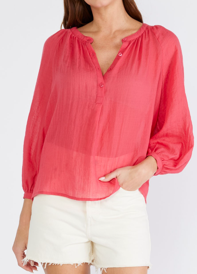 Subtle sheer top with a round neckline and 3/4 length sleeve.